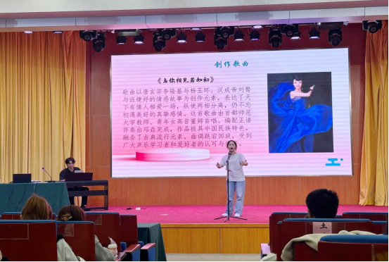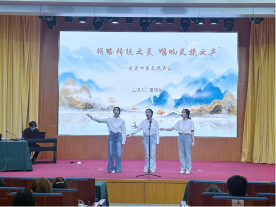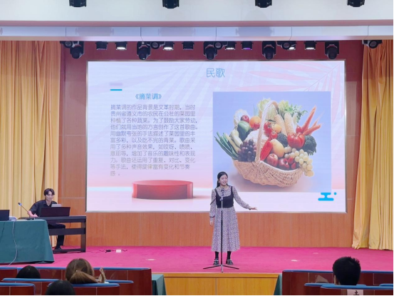 在讲座中,雷晓伟老师依次向大家介绍了中国民族声乐的定义、发展进程、特点、作品风格的分类、传承与发展及总结与展望。在民族声乐的特点介绍中,雷晓伟老师以四川民歌《峨眉酒家》为例,现场示范演唱,让大家了解民族声乐中的“润腔”、“依字行腔”及“衬词”的特点。在介绍民族声乐作品风格分类中,特别邀请王振华老师、程紫雨老师及刘金、刘诗瑾两位同学进行范唱,让大家对戏曲元素歌曲、地方民歌、古诗词歌曲及创作歌曲有了更深刻的认识。最后,雷晓伟老师以“鄂东南苏区革命歌曲音乐会”为例,介绍了我校ok138cn太阳集团在追寻红色记忆,助力红色音乐文化传承和传播方面所进行的实践,并呼吁大家一起为传统文化的传承与弘扬尽微薄之力。