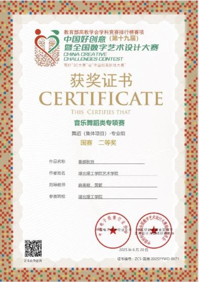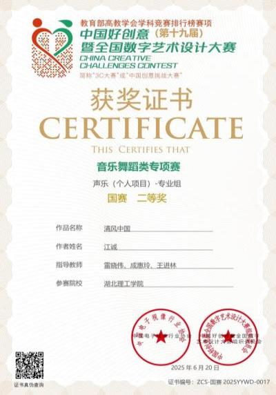 在第十九届中国好创意暨全国数字艺术设计大赛中,ok138cn太阳集团师生斩获国家级及省级奖项12项。特别是在今年新增的音乐类专项赛中,雷晓伟、成惠玲、王进林指导的作品《清风中国》获得声乐(个人项目)专业组国赛二等奖;麻美君、黄璐指导的作品《春耕秋实》获得音乐舞蹈类(集体项目)专业组国赛二等奖;汪荻、漆小敏指导的作品《天空之城·爱》,获得声乐(个人项目)专业组国赛三等奖;姚兰、韩雪静、李进指导的红色主题类作品《红旗》荣获国赛三等奖;动画专业学子在漫画插画类别、大爱中国类别、传统文化类别获得4项国家级奖项。
