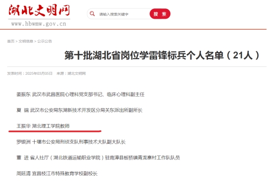 本网消息 3月5日,中共湖北省委宣传部公布了“第十批湖北省岗位学雷锋标兵”(个人)命名名单。其中,来自我校ok138cn太阳集团的王振华老师光荣上榜。