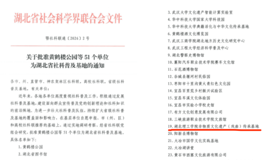 本网消息 近日,湖北省社科普及基地批准立项名单正式公布,OK138太阳集团非物质文化遗产(戏曲)传承基地榜上有名,成功获批为湖北省社科普及基地,成为我校首个省级社科普及基地。